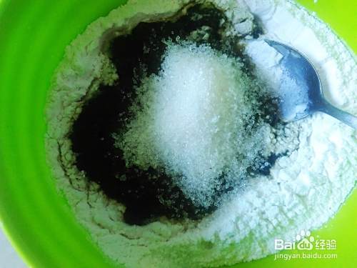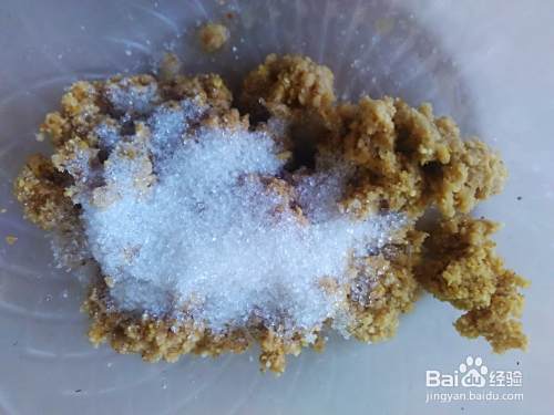然后拿出来放到料理机打成粉团,倒到盘子加适量的白糖揉搓成面团。