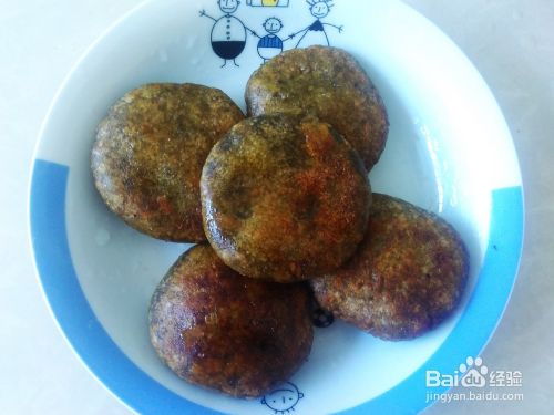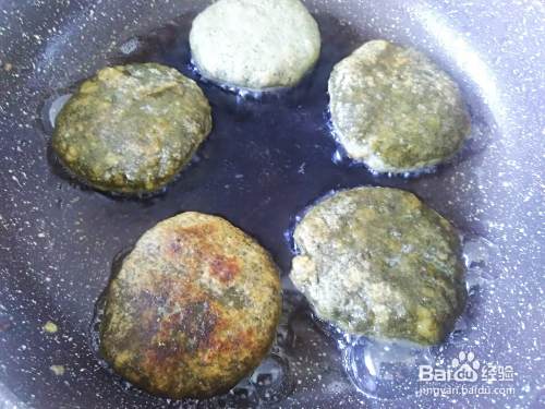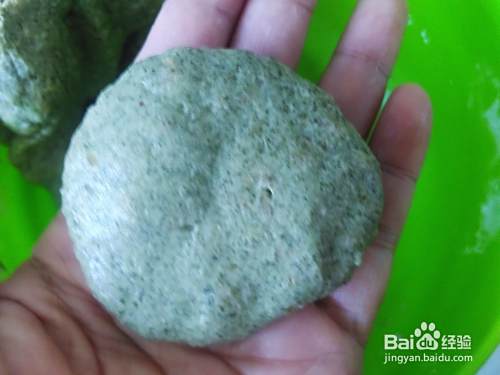 抓适量的艾叶粉团捏成饼状,然后放板栗丸子进去,收口再压成饼状。