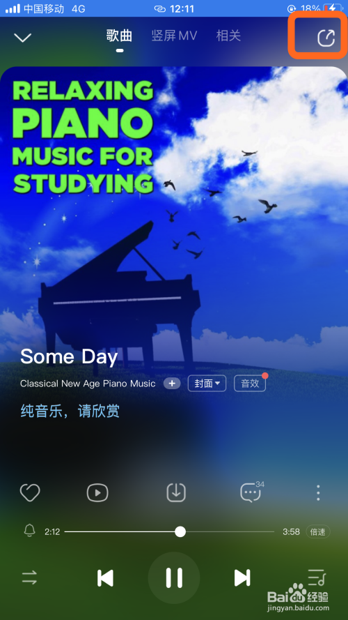 进入歌曲的播放页面,点击右上角的【分享】按键;