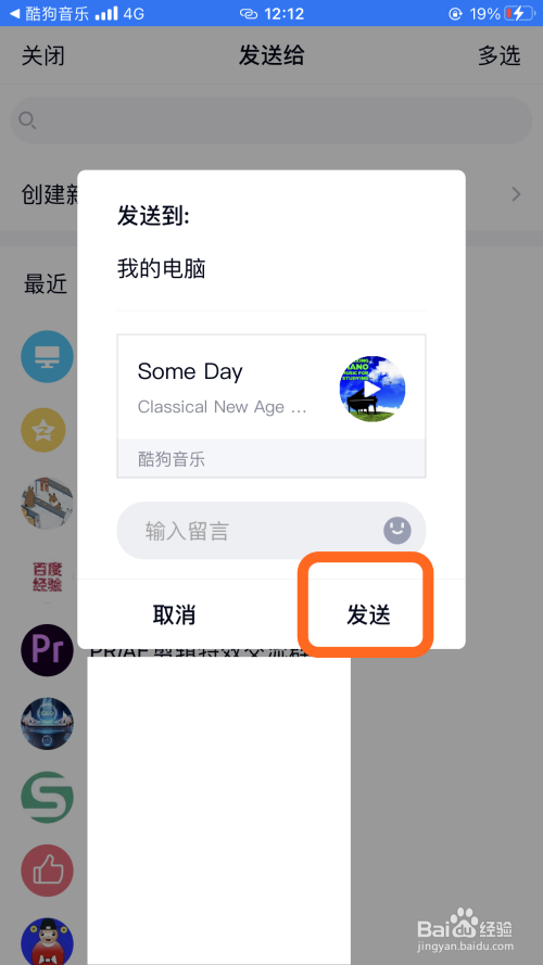 弹出分享发送对话框,点击【发送】,完成歌曲音乐的分享,成功将歌曲推送给好友;
