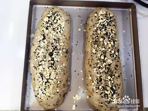 将发酵好的面团上喷上一层清水,撒上黑芝麻和麦片,也可以再撒一些瓜子仁,然后再喷上一层清水
