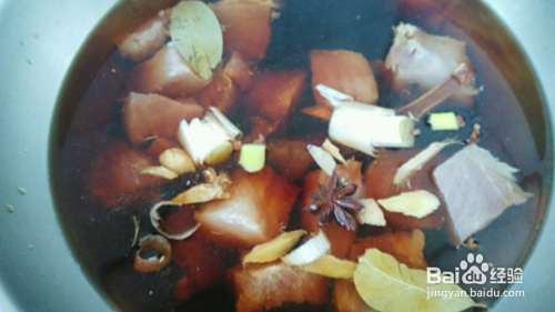 肉连同所有大料放入冷水锅中,冷水没过猪肉一厘米就可以了。倒入生抽,老抽,白糖一起煮,大火煮开转中火,一直煮到猪肉软烂。尝一尝,再放入适量盐调味。