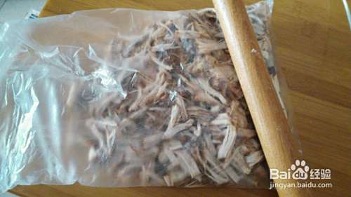 再放入保鲜袋,用擀面杖使劲敲,让肉松散。