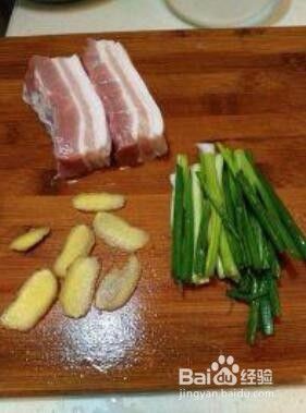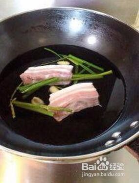 锅里加入水,下五花肉、下几片姜片,葱段,开火,加入少许米酒,煮开焯水