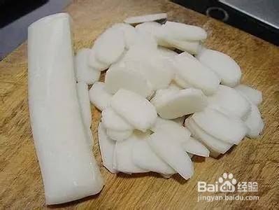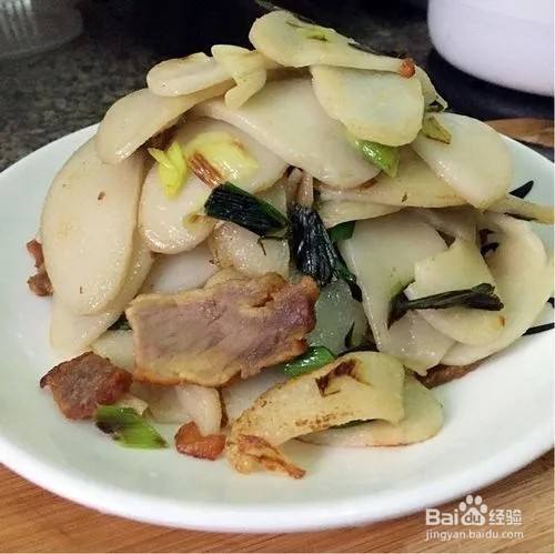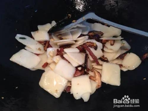 锅内倒入少许油,放入葱花炒香,放入腊肉煸炒2分钟,放入年糕翻炒3分钟左右。