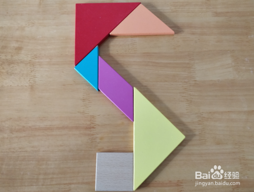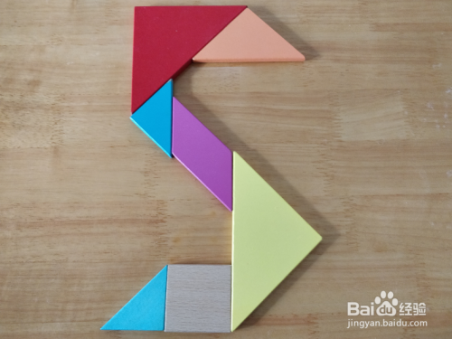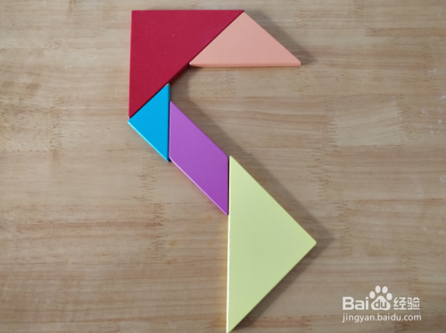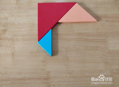 摆上另外的小三角形,放在正方形的左侧挨着,直角在右侧下端,如图。5就拼组完成了。