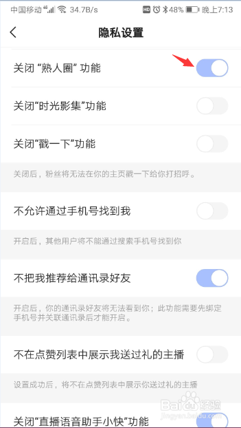在快手内,点击设置,点击隐私设置,将关闭熟人圈功能右边的开关打开即可关闭熟人圈功能