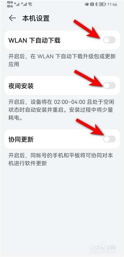 页面跳转,把自动下载、夜间安装、协同更新3个选项关闭即可。
