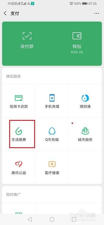 第一步手机上打开微信,进去支付界面,点击生活缴费