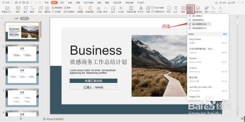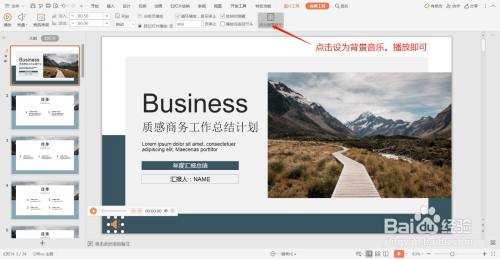 在插入工具栏中,找到音频,并点击:嵌入背景音乐
