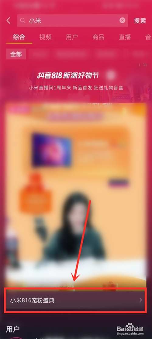 打开抖音app,搜索【小米】,点击搜索结果顶部【直播入口】进入小米直播间,即可观看小米816宠粉盛典直播。