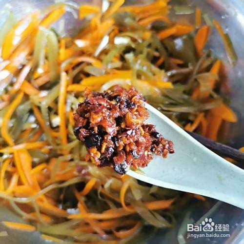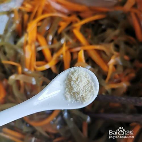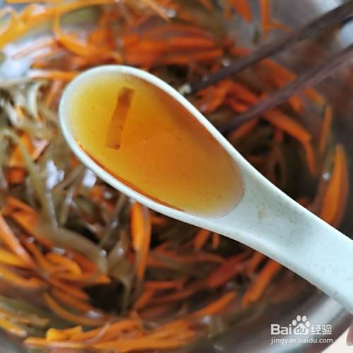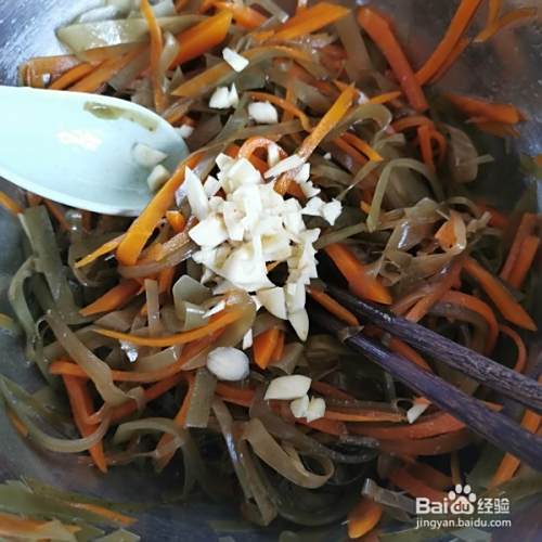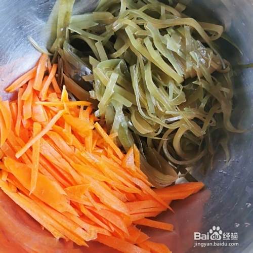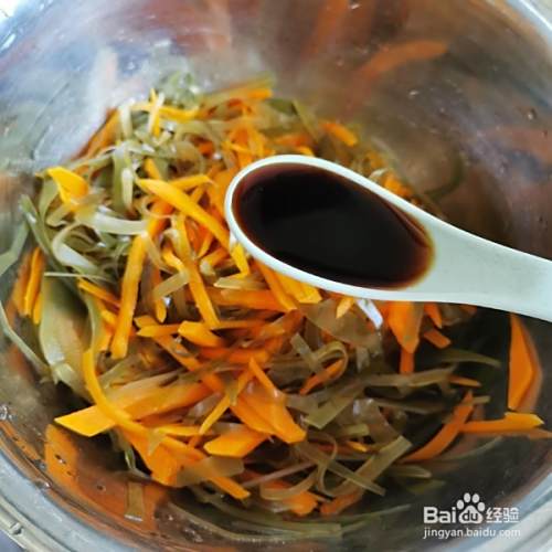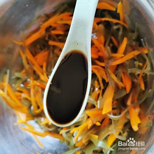 海带胡萝卜丝放入大容器中,加入两勺陈醋