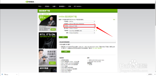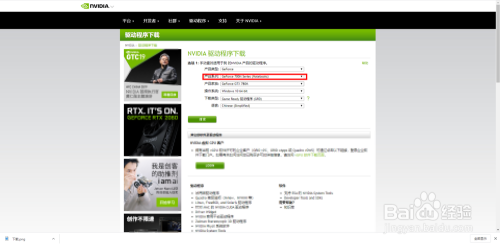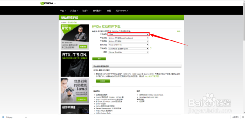 然后在NVIDIA驱动程序下载页面选择"产品类型"