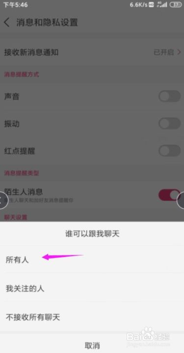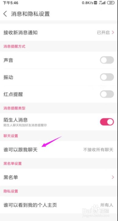 界面里【谁可以跟我聊天】点下,如图。