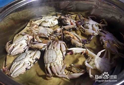 蒸锅添水铺上屉布花盖蟹翻过来摆好动作要快还要灵敏度要高防止被蟹钳夹手哦均匀的撒上盐开始大火蒸