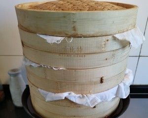 案板上铺油纸,倒扣在案板上,掀去蒸布,晾凉