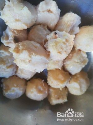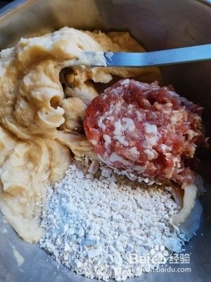捣鼓成泥状,捣成泥后,加入地瓜粉,肉沫,适量盐,味精,生抽,水,搅拌均匀