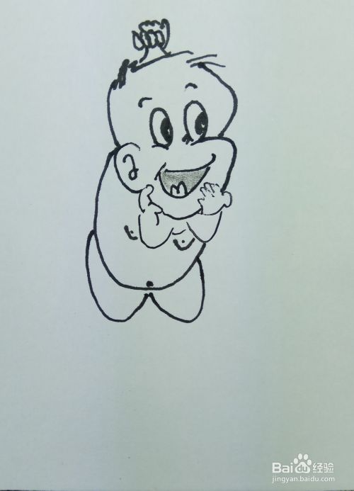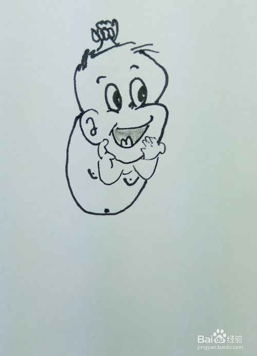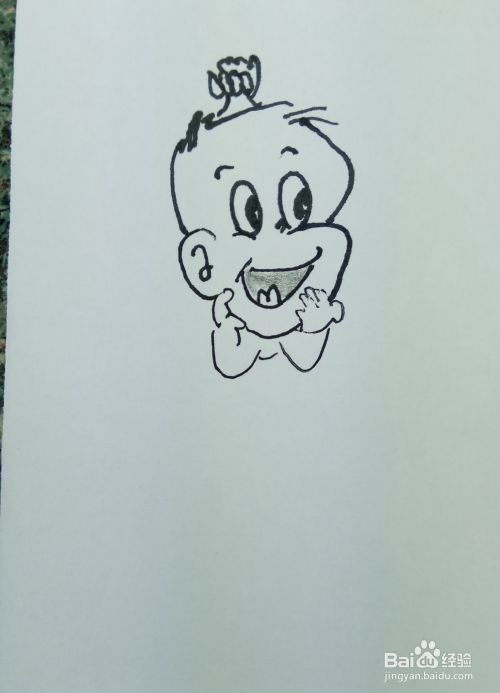 在白纸上用线条和曲线画出卡通小子的头部轮廓,然后再画出他的五官和头发,画出他的两个胳膊和手。