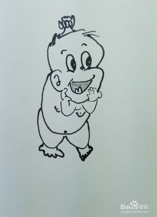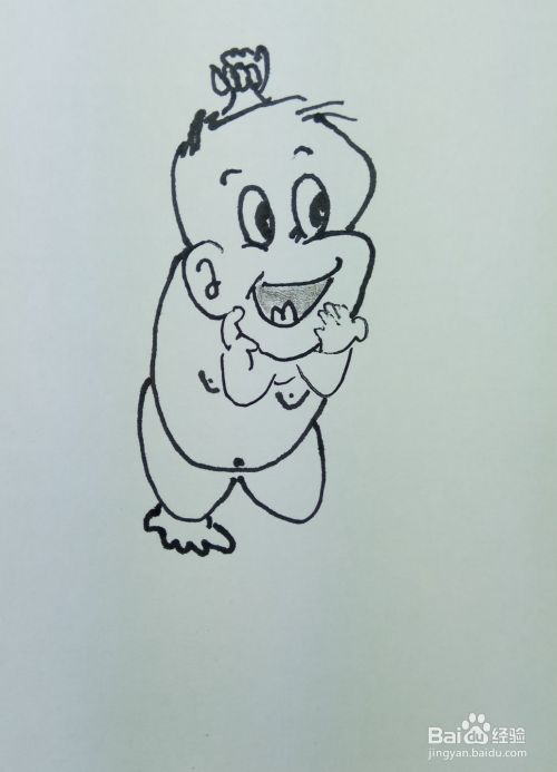 用线条和曲线画出他的上半身部分,再画出他身体上的特征,他正张大了嘴巴,好奇的向前看。