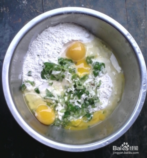 首先把面粉、鸡蛋、切好的小葱都放入盆中,再加入食用盐、十三香、鸡精麻辣南德佐料。(创新:也可加入切成颗粒的火腿肠、辣条、酸萝卜、胡萝卜)