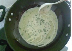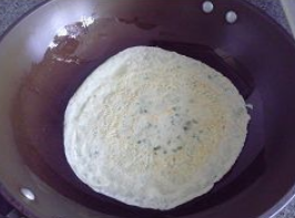 然后将浆糊用勺子舀一勺均匀铺在锅里,然后用铲子摊匀、摊平。