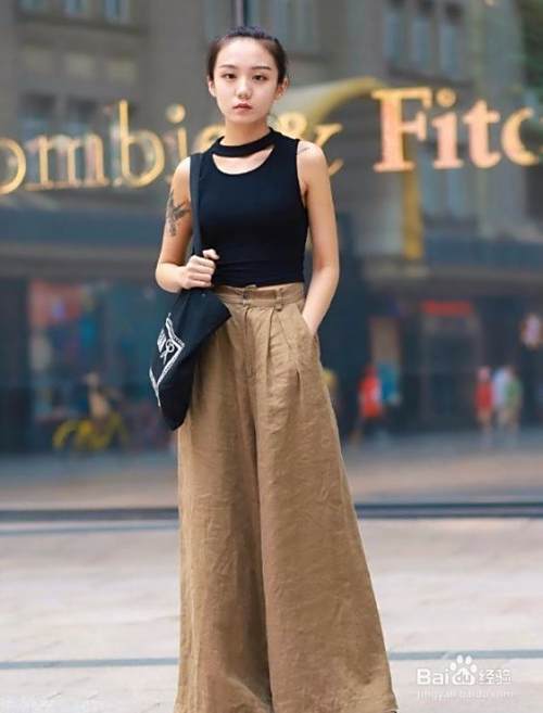 这款咖啡色阔腿裤款式很个性,是很宽松的裤型,所以不管腿粗与否,都可以穿,而且长度很适合搭配高跟鞋,上衣搭配一件黑色背心,这样穿出来很显腿长。