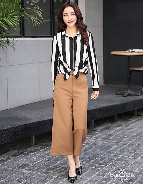 搭配六:咖啡色西装裤+棕色竖条纹雪纺衫