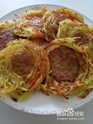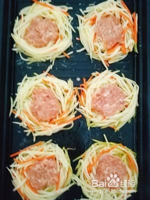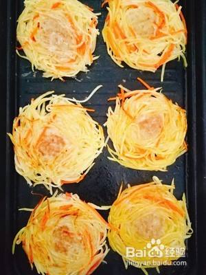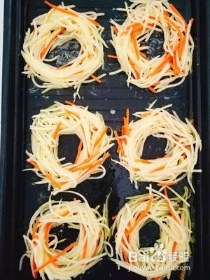 平底锅刷上少许食用油,土豆丝下锅弄成鸟巢形状