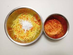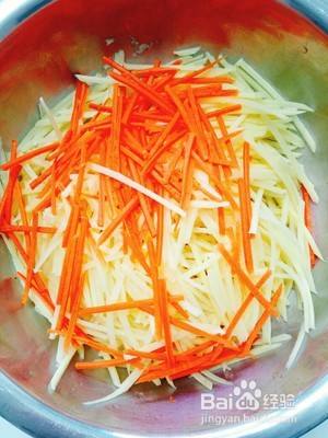 土豆胡萝卜擦丝,清水冲洗一遍控干水份