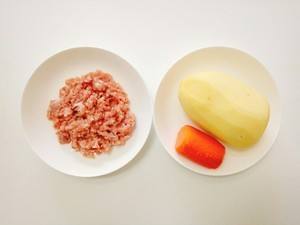 准备好需要的食材,土豆去皮,胡萝卜去皮,猪肉馅
