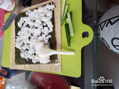 将海苔放在寿司卷帘上,铺上晾凉的米饭,海苔边缘要空出一点,不要将米饭铺满。