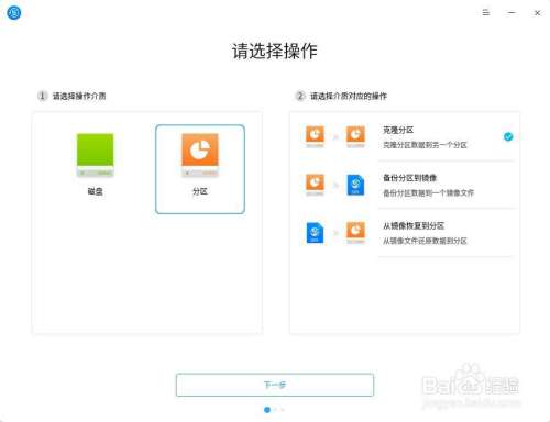 3.1 在深度备份还原工具界面,选择“分区”为操作介质,选择“克隆分区”,点击 下一步。