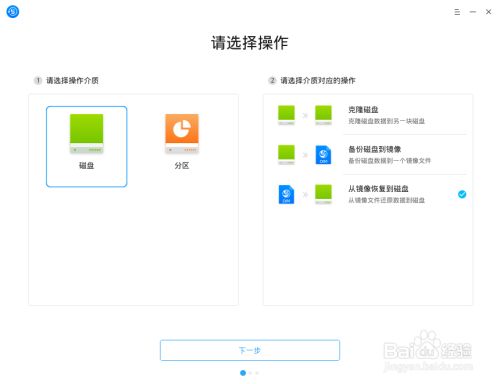 2.2.1 在深度备份还原工具界面,选择“磁盘”为操作介质,选择“从镜像恢复到磁盘”,点击 下一步。
