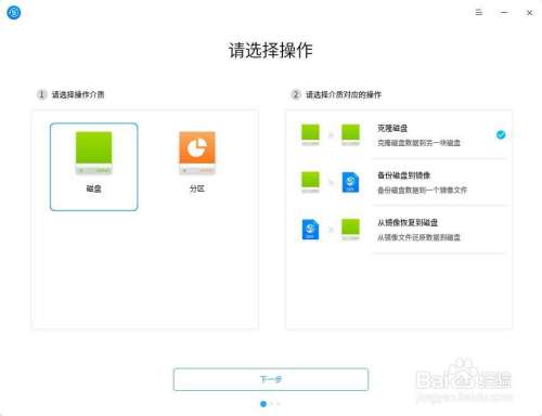 1.1 在深度备份还原工具界面,选择“磁盘”为操作介质,选择“克隆磁盘”为对应的操作,点击“下一步”。