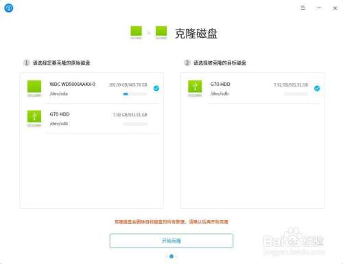 1.2 选择要克隆的原始磁盘和被克隆的目标磁盘,点击“开始克隆”。