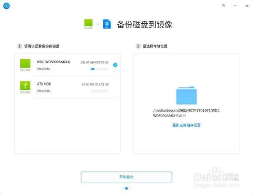 2.1.2 选择您要备份的磁盘,然后点击“请选择存储位置”。选择空间充足的另一磁盘为存储位置之后,点击“保存”回到工具界面,点击“开始备份”。
