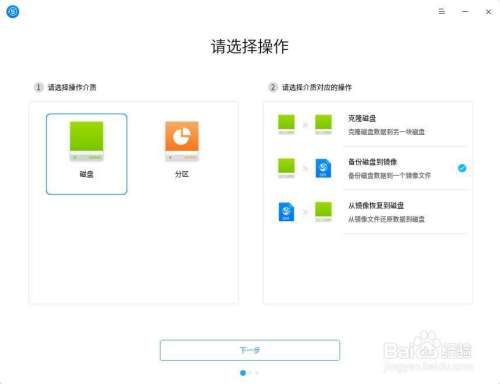 4.1.1 在深度备份还原工具界面,选择“分区”为操作介质,选择“备份分区到镜像”,点击“下一步”。