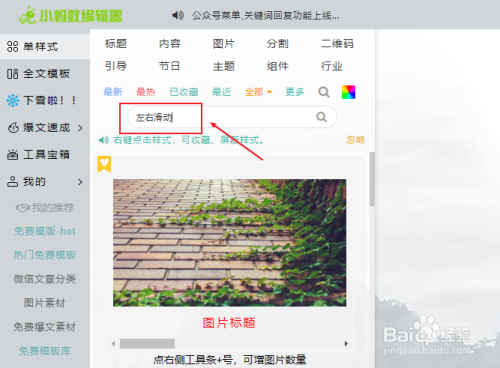 如果想要图片实现左右滑动的效果,微信公众号后台的编辑功能满足不了我们的需求,这时候需要借助工具,打开编辑器直接搜索关键字“左右滑动”,然后点击放大镜图标进行搜索;