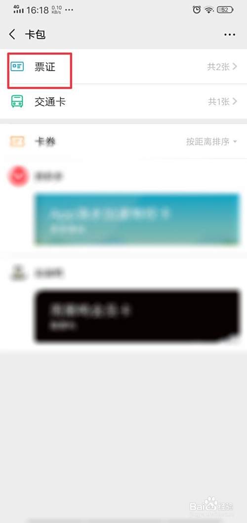 进入卡包功能界面,显示我们目前所持有的全部卡包,我们点击“票证”选项。