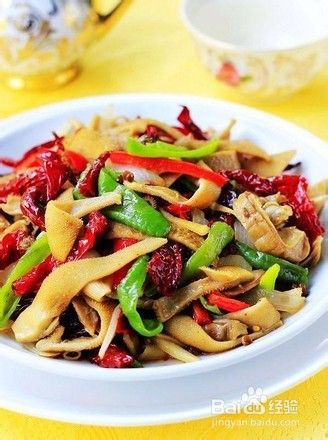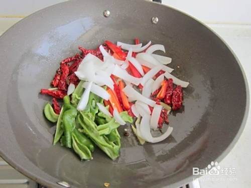 热锅凉油,油热8成,下花椒粒、爆出香味,加辣皮子、姜丝翻炒出香味,下青红辣椒、洋葱翻炒出香味。