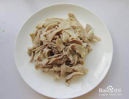 把羊肚用开水加花椒粒煮3分钟左右,捞起晾凉,切长宽条。
