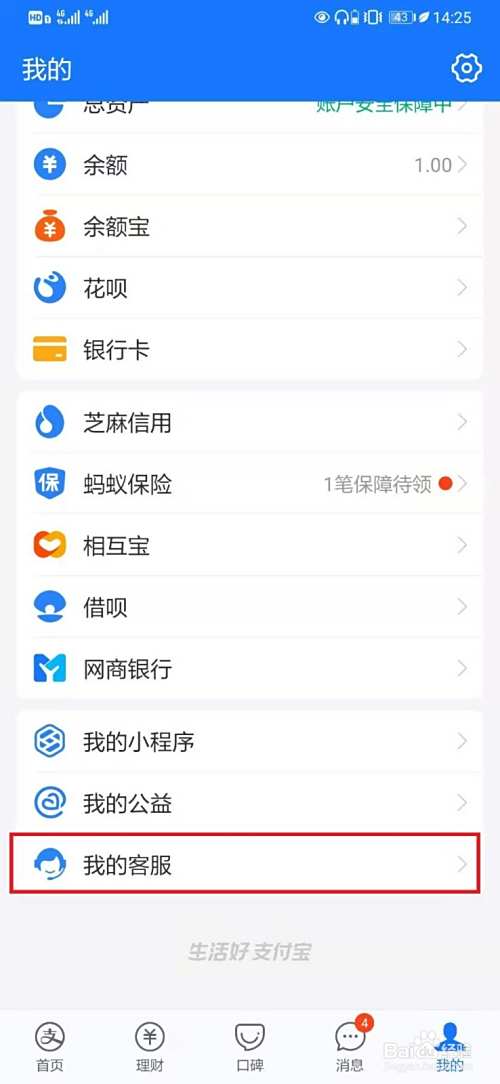 在打开的支付宝上,打开【我的->我的客服】,如下图所示。