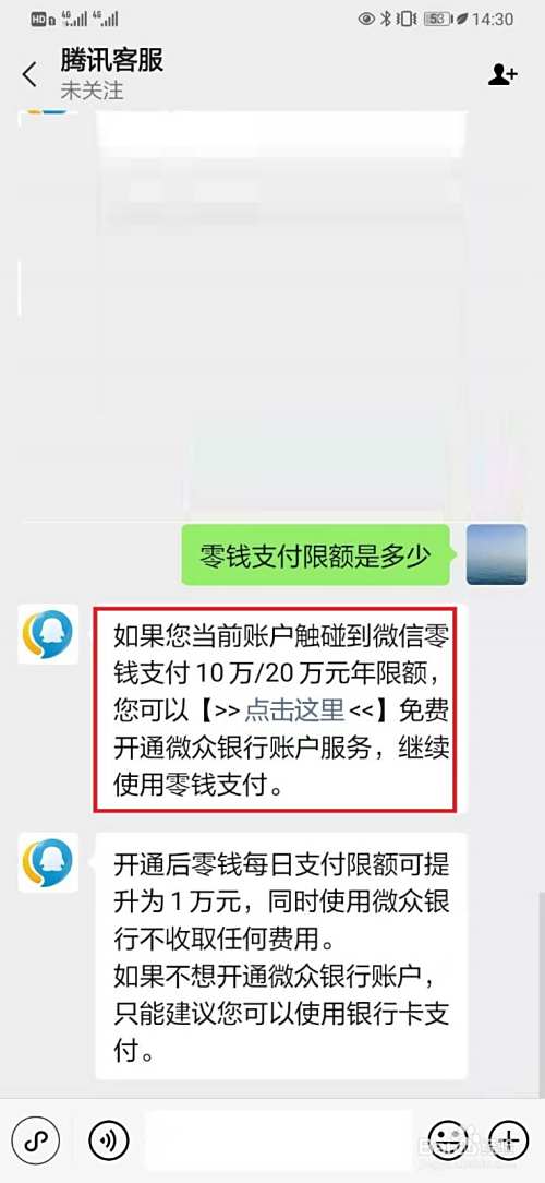进入【腾讯客服】咨询页面,根据腾讯客服回复信息,可以知道通过微信钱包支付年限额【10万~20万/年】。