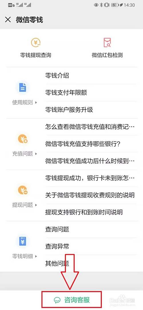 在钱包页面,依次操作【常见问题】-【咨询客服】选项,如下图所示。