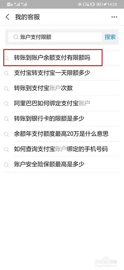 进入我的客服页面,搜索并选择【转账到账户余额支付限额】。如下图所示。