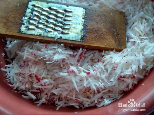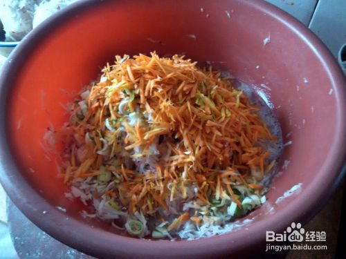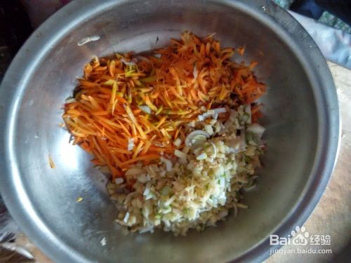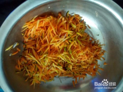 萝卜擦成丝,放盐,抓出水备用。胡萝卜擦成丝。
