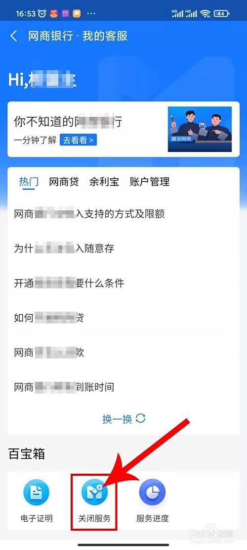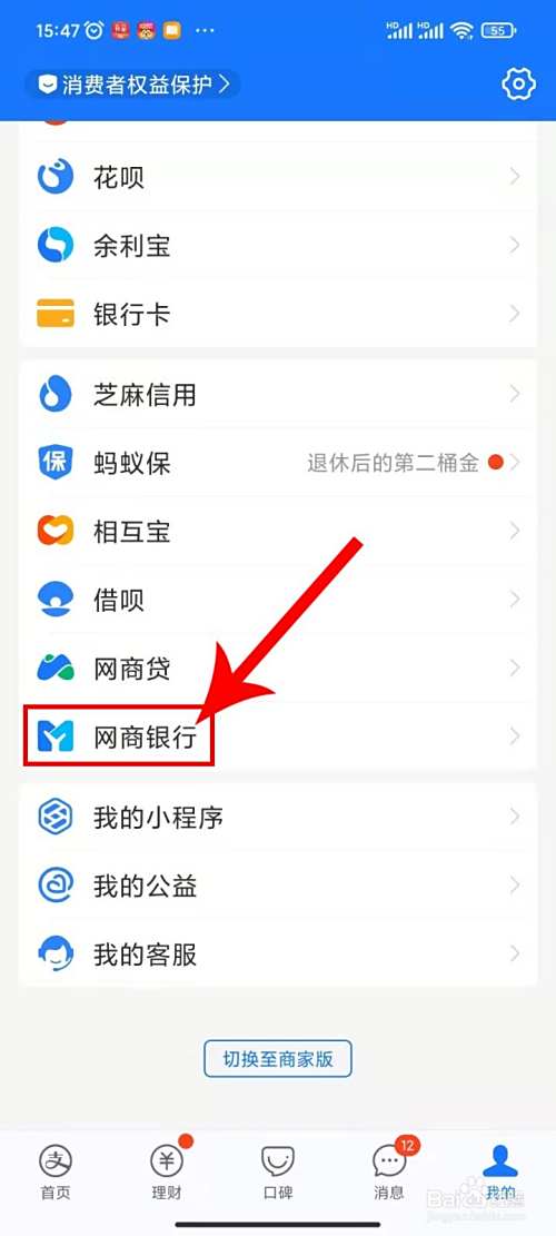 我们在底部打开红色箭头方框处,选择点击“网商银行”项。【下方如图所示】