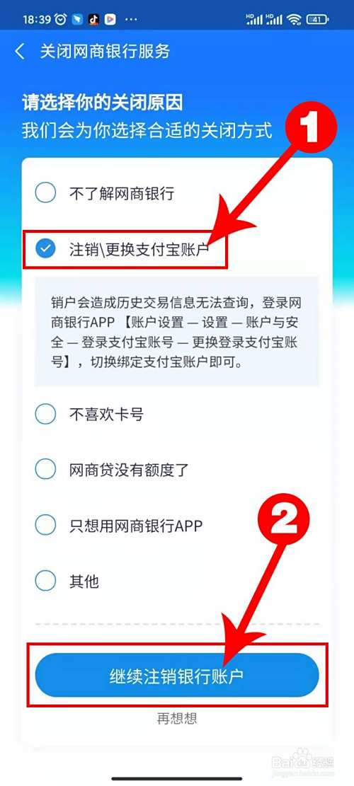 最后,在关闭网商银行服务页面标记❶处,选择点击“注销\更换支付宝账户”项。在❷处,点击“继续注销银行账户”按钮。【下方如图所示】