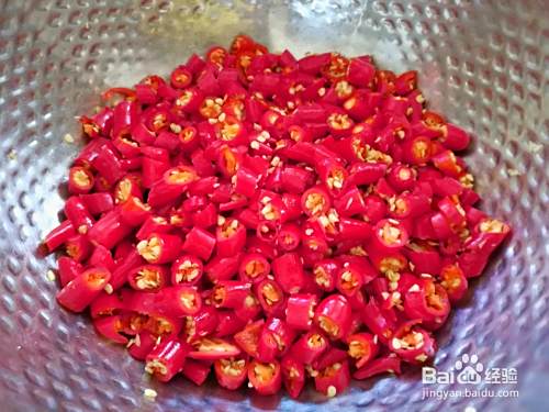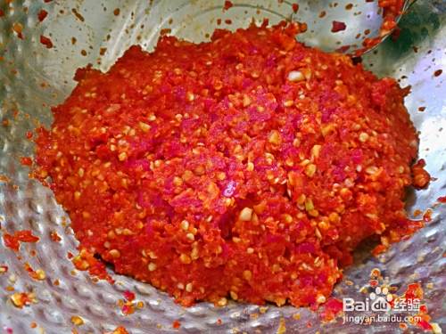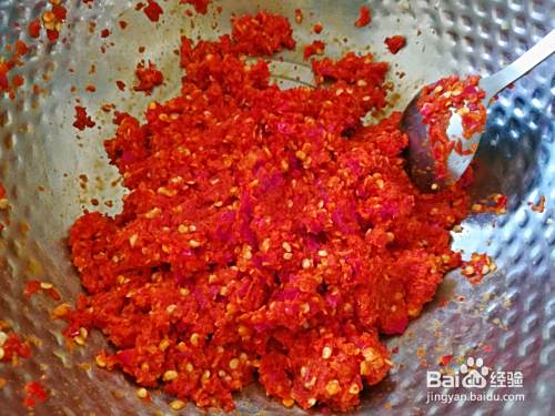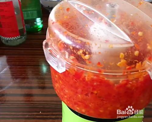 首先,把小米椒和扇贝/虾仁切到搅拌机里粉碎。如果没有,就用菜刀把它们切碎。