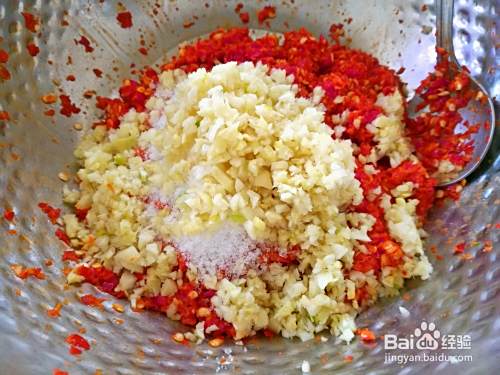 将蒜、姜、盐、芝麻油、白糖、白酒和白醋加入小米胡椒粉中搅拌均匀。
